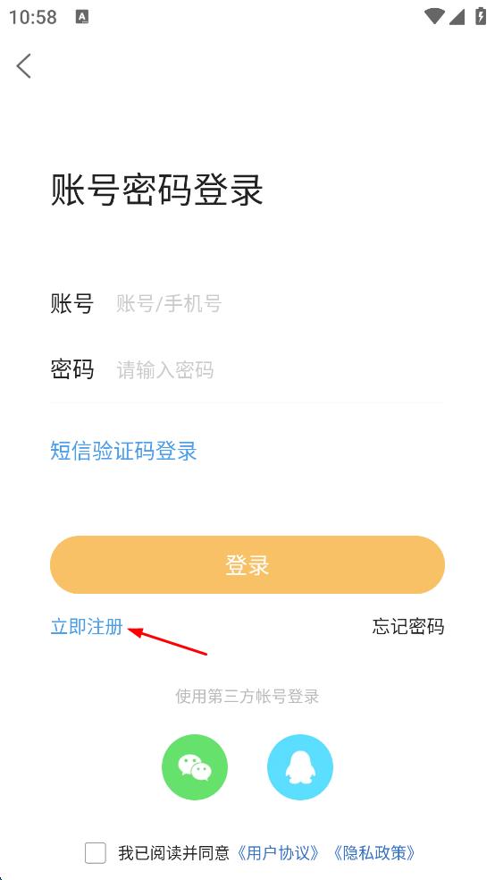 3、在账号密码登录页面,点击立即注册,进入输入手机号页面。