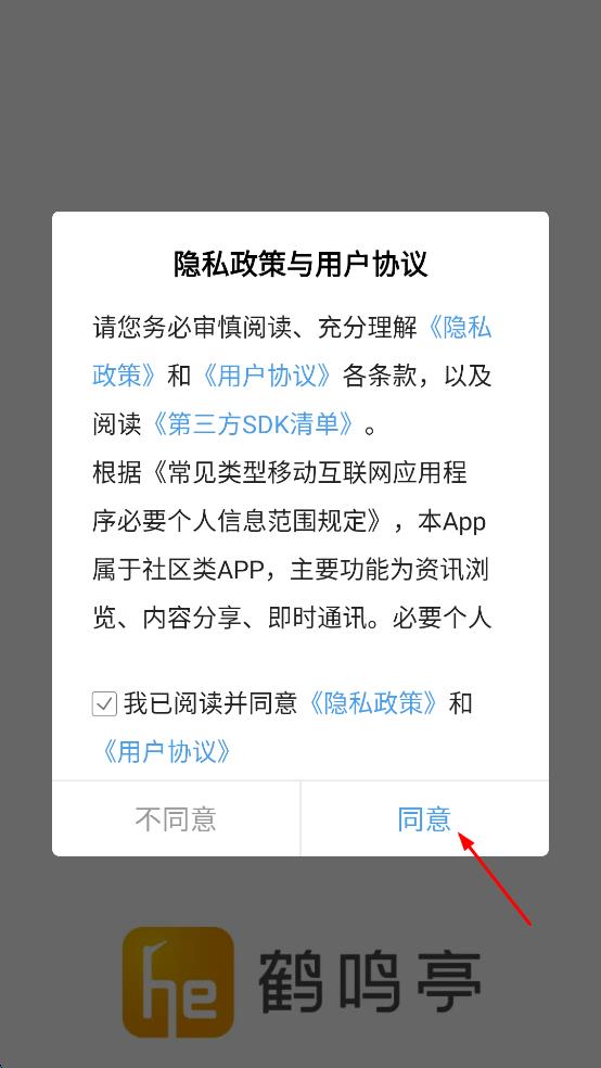 1、打开鹤鸣亭,在弹出的隐私政策与用户协议页面,勾选已阅读并同意相关协议,点击同意,进入鹤鸣亭首页。