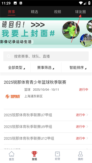 2、在发现页面,点击球友圈,进入球友圈页面。
