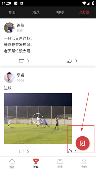 3、在球友圈页面,点击右下角的红色编辑图标,准备发帖。