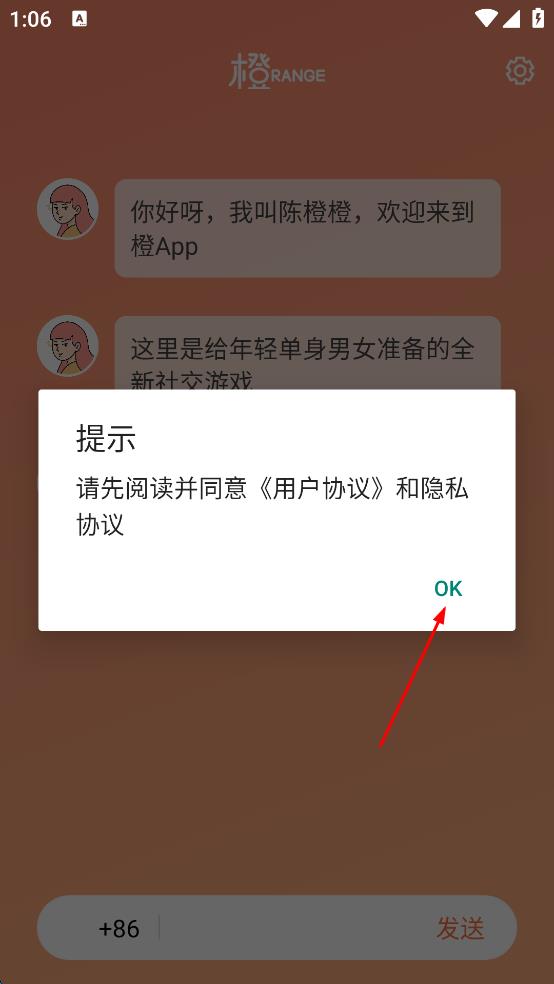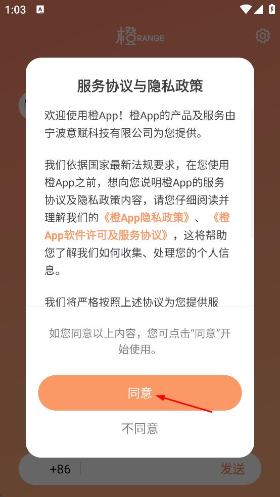 1、打开橙App,会弹出服务协议与隐私政策页面,仔细阅读后点击同意按钮。