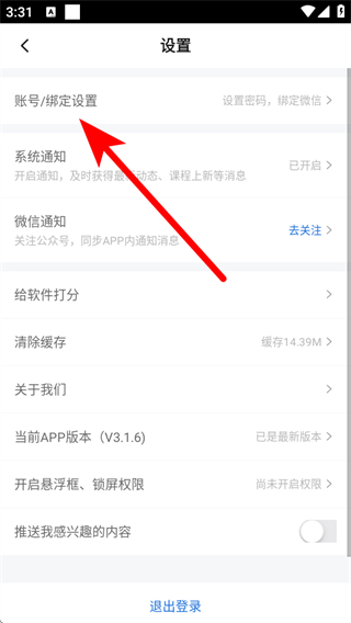 2、在设置的页面,点击账号/绑定设置,进入账号绑定设置页面。