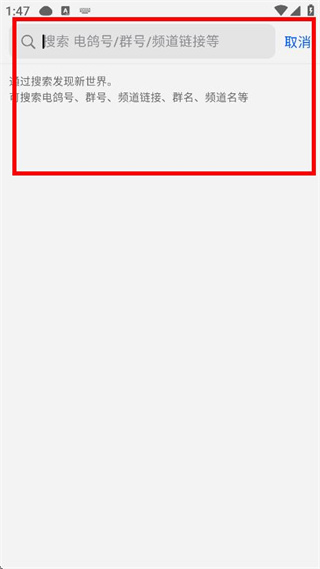 4、在搜索页面,可输入电鸽号、群号、频道链接等进行搜索。