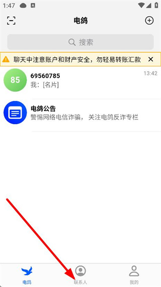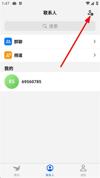 1、在电鸽主界面,点击底部的联系人,进入联系人页面。