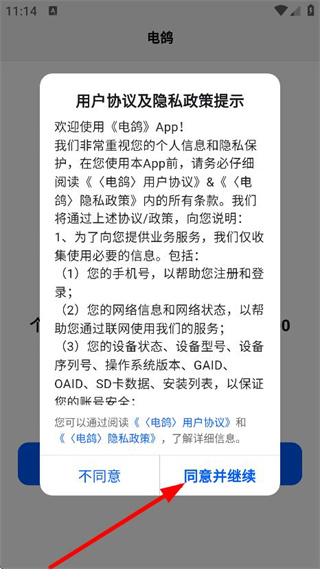 1、在用户协议及隐私政策提示弹窗中,点击同意并继续,进入页面。