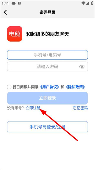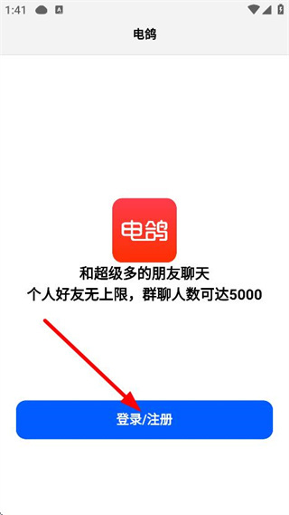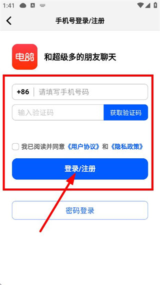 2、在电鸽登录注册引导页面,点击登录注册,进入密码登录页面。