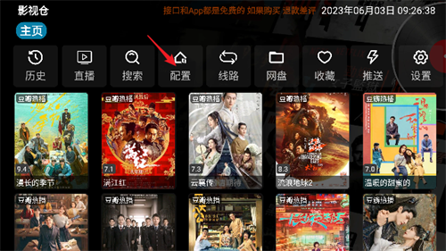 1、首先我们需要先登入到影视仓平台,在主页中最上方,找到【配置】,点击进入,注意,这里我们需要输入或者选择请求地址,方便后续发送请求;