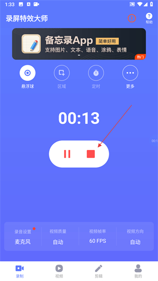 录屏特效大师支持游戏、网课、音乐等多个场景的录制,一键设置悬浮窗功能简单易用,还可以随时暂停和开启录制,支持在线剪辑视频和录屏,有方便的视频处理功能,在线录制更靠谱。