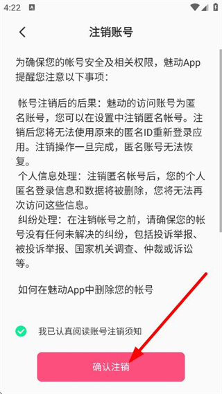 4、在注销账号说明页面,勾选同意相关须知后,点击确认注销,进行账号注销操作。