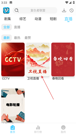 2、在直播分类页面,点击卫视直播,进入卫视直播播放页面。