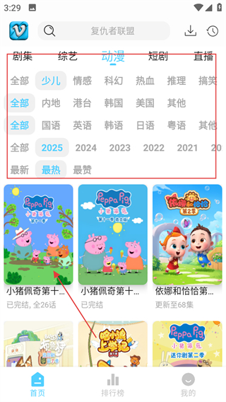 2、在动漫分类页面,可通过筛选条件找到想看的动漫,点击动漫封面,进入动漫播放页面。
