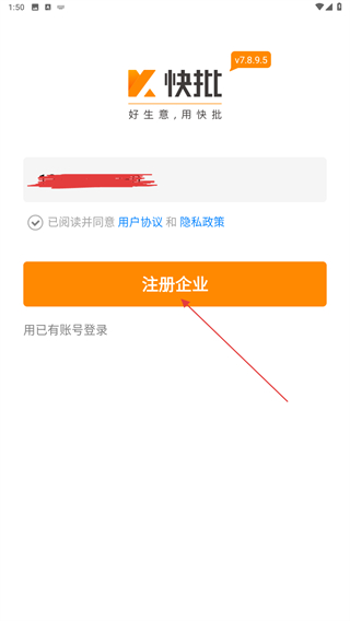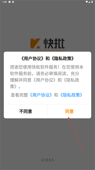 1、打开快批APP,进入时会弹出用户协议和隐私政策,点击同意的按钮。