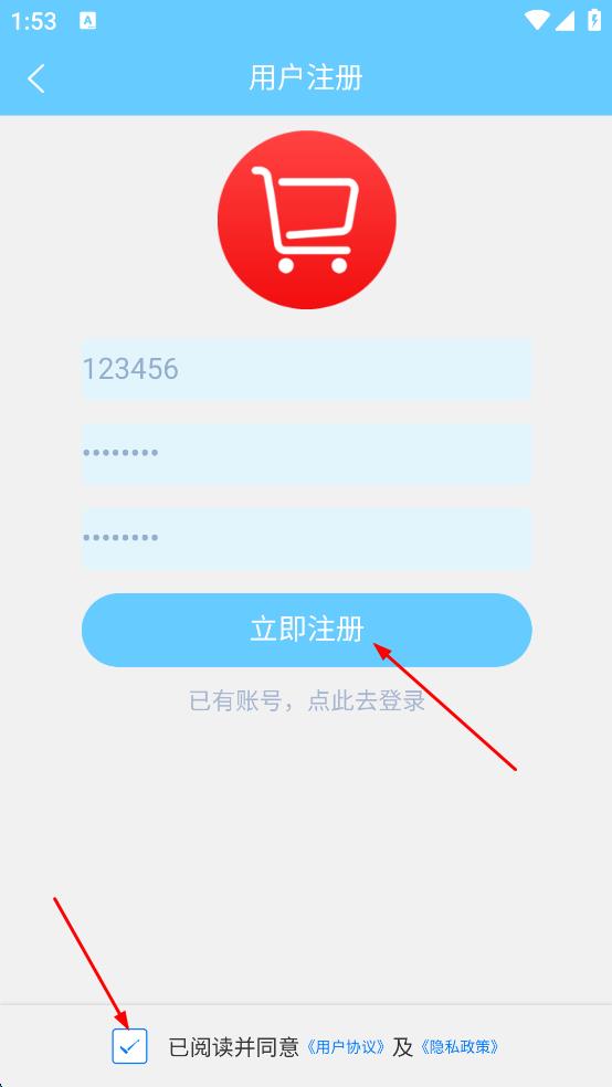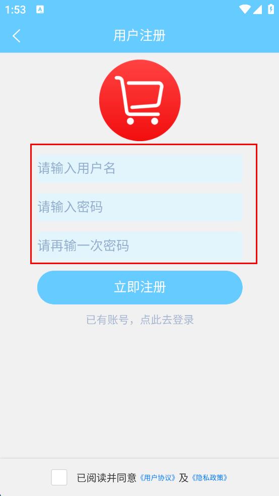 3、在用户注册页面输入用户名、密码并再次输入密码,勾选已阅读并同意相关协议。