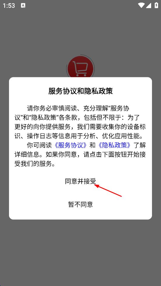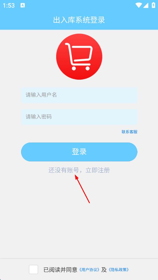 1、打开出入库系统,弹出服务协议和隐私政策提示,点击同意并接受,进入出入库系统登录界面。
