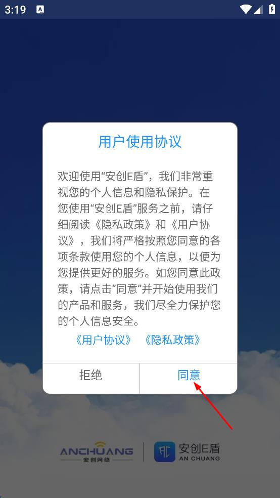 1、打开安创E盾,弹出用户使用协议提示,点击同意,进入登录界面。