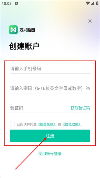 4、在创建账户页面,填写手机号码、密码、验证码,点击注册,完成账户创建。