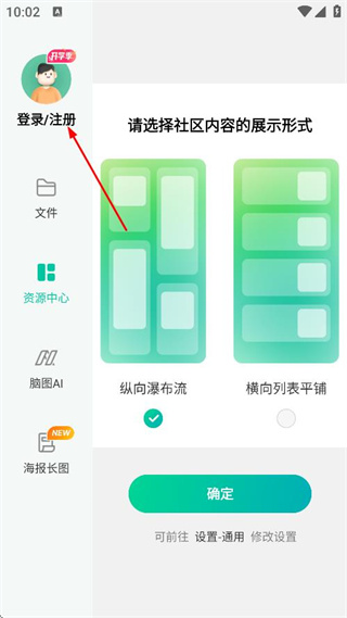 2、在社区内容展示形式选择页面,点击登录注册,进入登录账号页面。