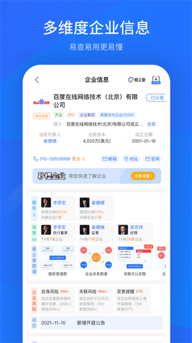 爱企查app可以在线查询工商信息、企业信息,软件内置了海量最新的征信信息数据,无论是查询企业还是个人都可以快速搜索出相关信息,让你能更快地了解到企业的相关信息,查询所需资料,赶快来使用吧。