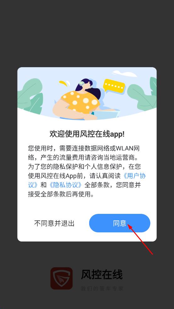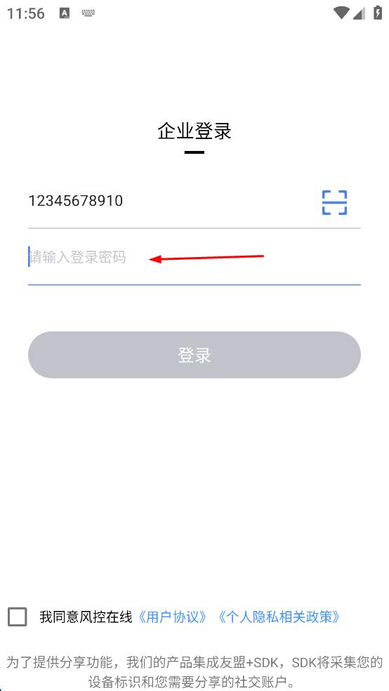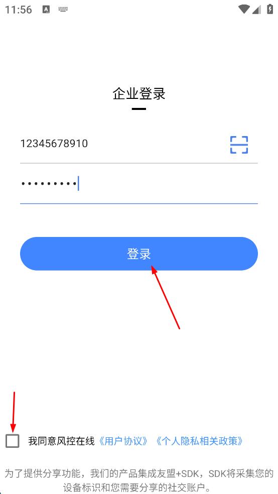 1、打开风控在线应用,在欢迎使用弹窗中,点击同意按钮,进入企业登录界面。