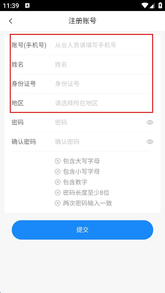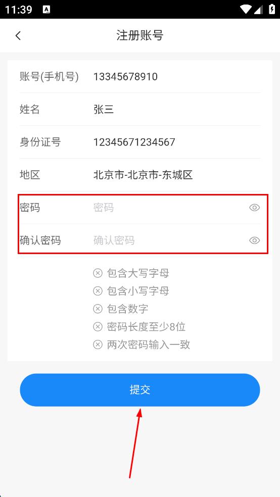 4、设置符合要求的密码并再次确认密码,完成后点击提交按钮,完成注册。