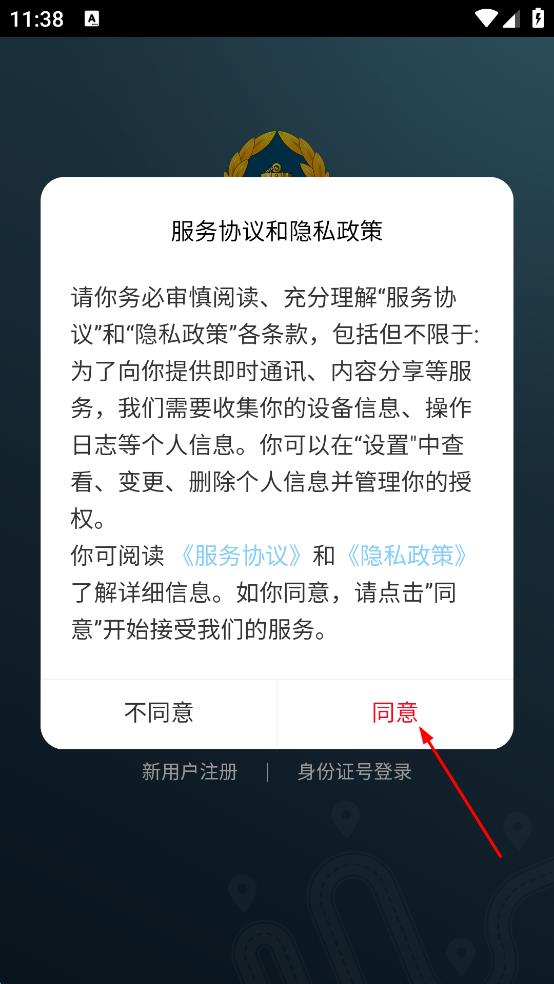 1、打开贵州运政应用,在服务协议和隐私政策弹窗中,点击同意按钮,进入登录界面。