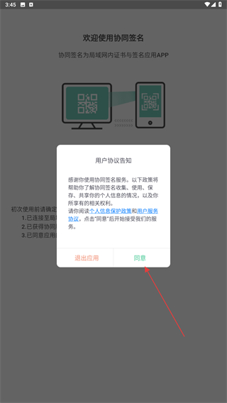 1、打开协同签名APP,进入时会弹出用户协议告知,了解后点击同意的按钮。