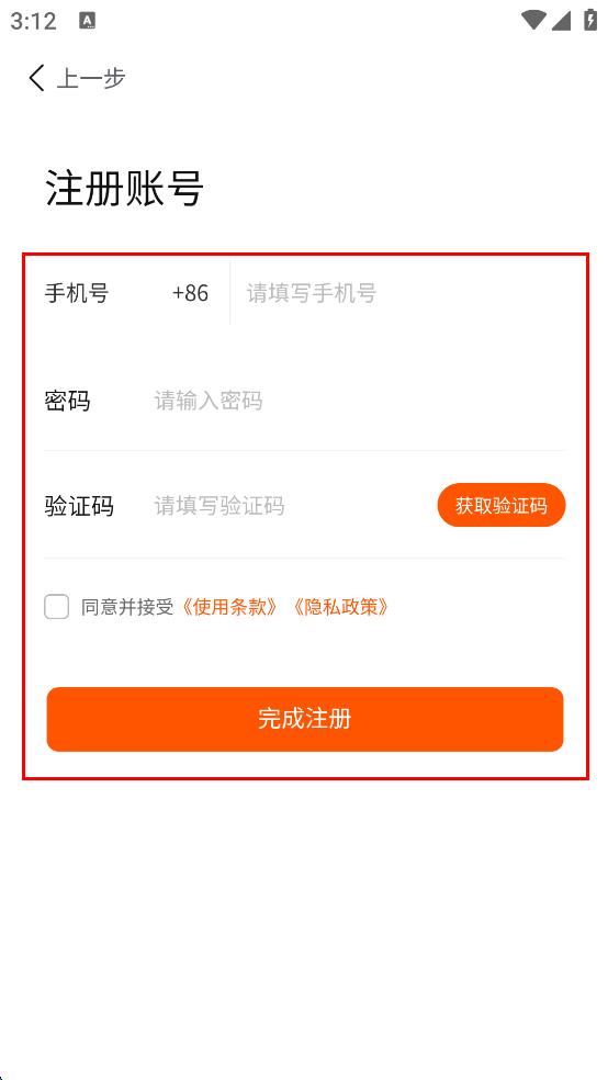 4、在注册账号页面,输入手机号、密码,点击“获取验证码”并输入,勾选同意相关条款,点击“完成注册”。