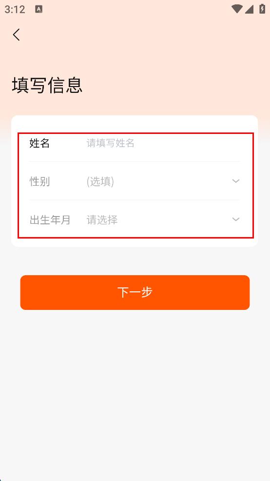 3、进入填写信息页面,填写姓名,选填性别,选择出生年月,然后点击“下一步”。