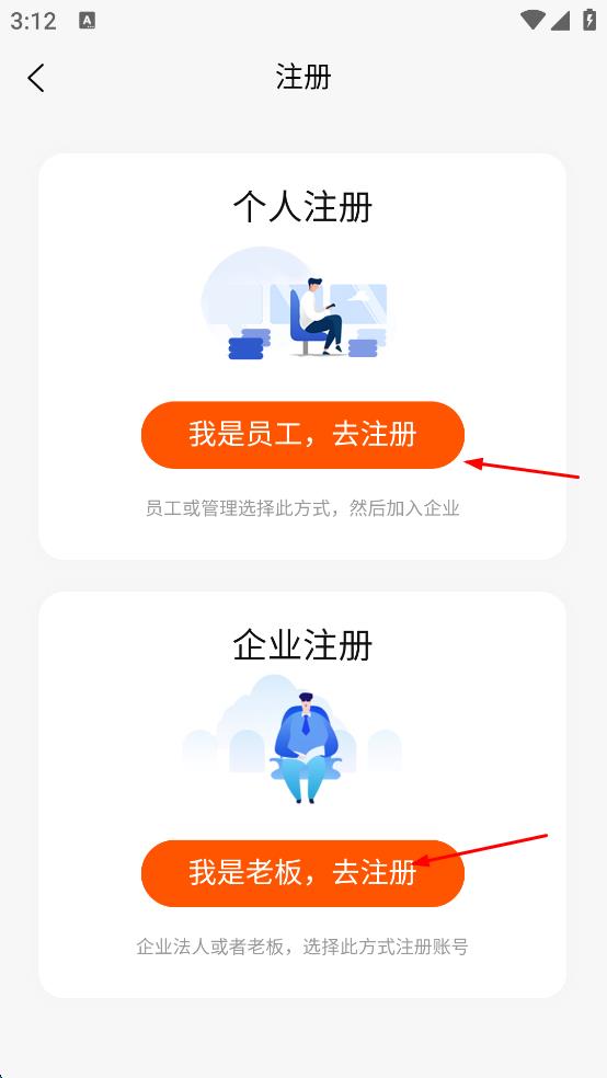 2、在注册页面,根据自身情况选择“我是员工,去注册”或“我是老板,去注册”。