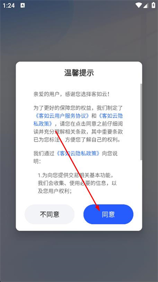 1、打开掌上客如云,在弹出的温馨提示界面,点击同意。