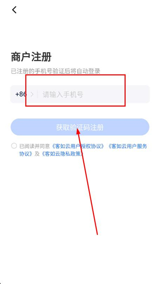 3、在商户注册页面,输入手机号码,点击获取验证码注册。