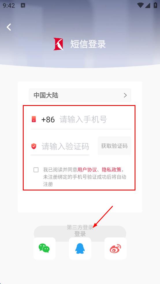 4、在短信登录页面,输入手机号和验证码,勾选“我已阅读并同意用户协议、隐私政策”,点击“登录”按钮完成登录。