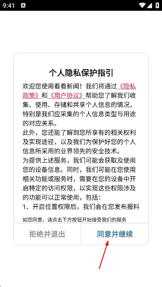 1、打开看看新闻APP,进入个人隐私保护指引页面,阅读相关内容后,点击“同意并继续”按钮,进入APP主界面。