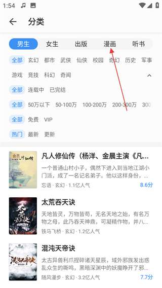 2、在分类页面,点击漫画,进入漫画分类页面。