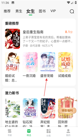1、在精选页面,选择喜欢的书籍,进入书籍详情页面。