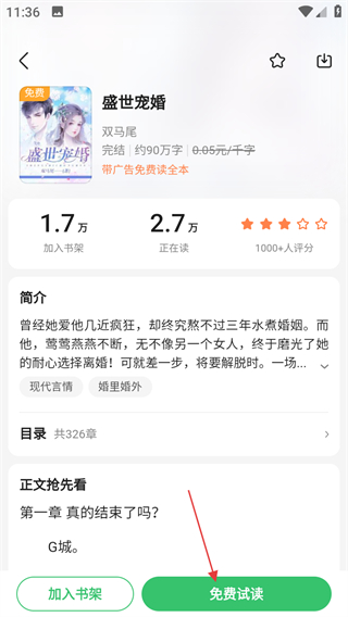 2、在书籍详情页面,点击免费试读,进入书籍阅读页面。
