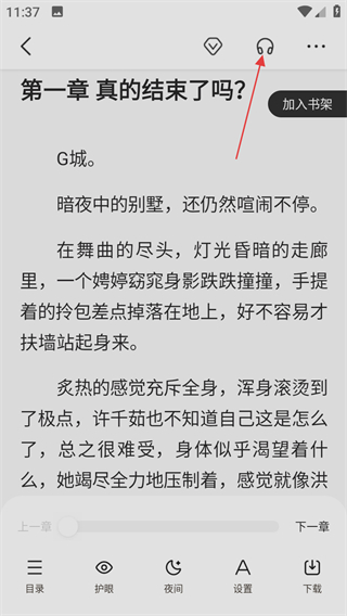 4、在菜单功能页面,点击上方耳机图标,可使用听书模式。