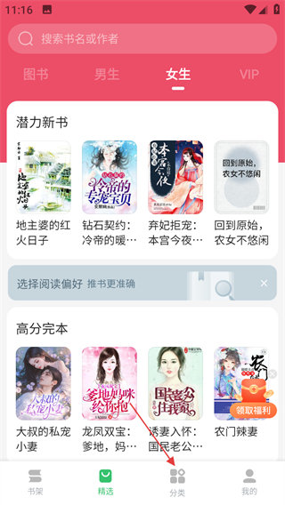 1、点击百度阅读器首页底部的分类,进入分类页面。