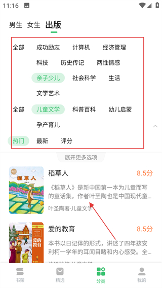 2、在分类页面,筛选分类选择想看的,进入书籍详情页面。