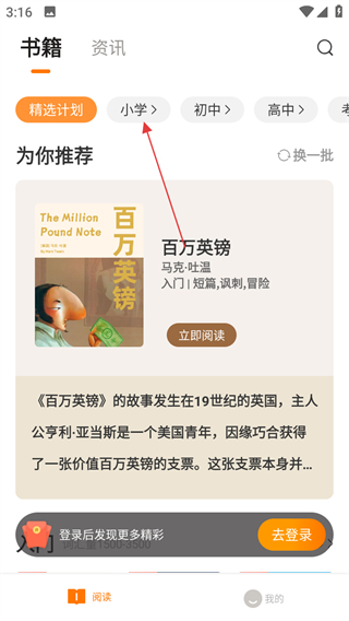 2、在小学书籍列表页面,选择喜欢的书籍,进入书籍详情页面。
