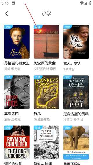 1、进入萝卜阅读首页,点击小学,进入小学书籍列表页面。