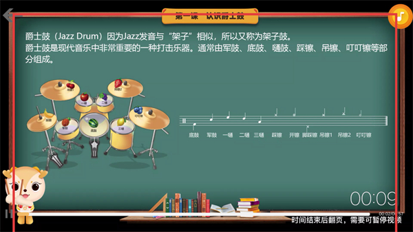 4、在课件学习页面,可进行爵士鼓相关知识的教学视频观看。