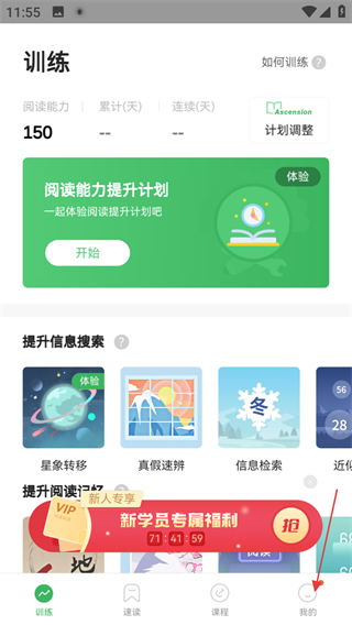 1、进入软件训练页面,点击底部我的,进入个人页面。