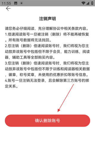 5、在注销声明页面,点击确认删除账号,完成账号注销操作。