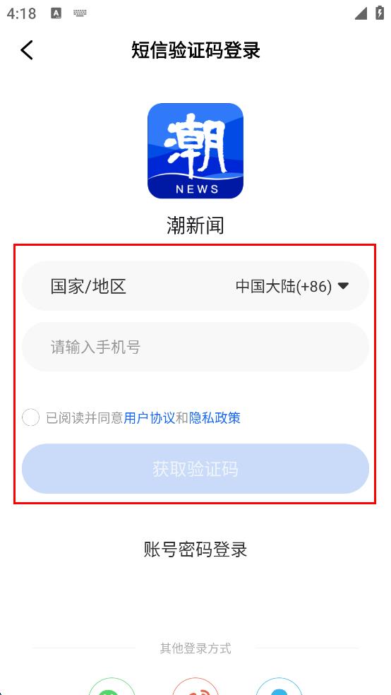 4、输入手机号,勾选已阅读并同意用户协议和隐私政策,然后点击获取验证码,填写验证码后完成登录。
