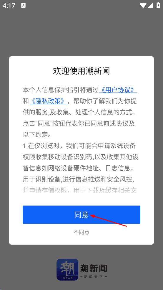 1、打开潮新闻,会弹出欢迎使用潮新闻的提示页面,仔细阅读后点击同意按钮。