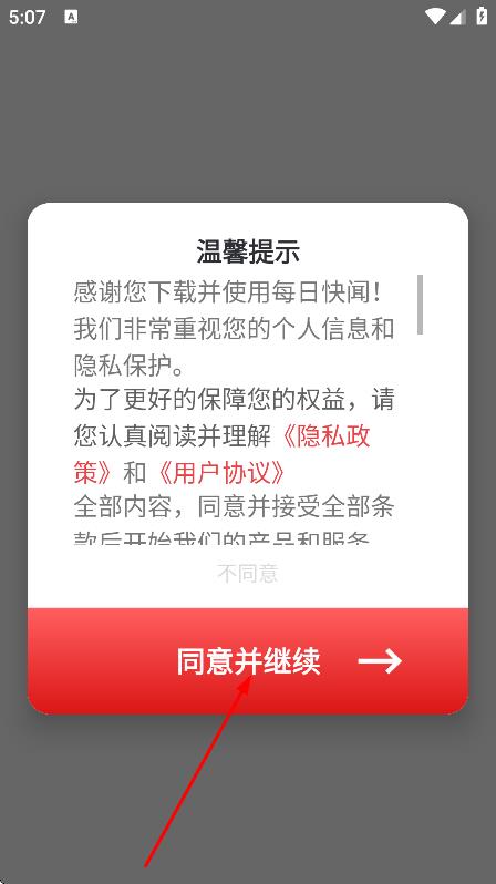1、在温馨提示弹窗中,点击同意并继续,进入每日快闻主页面。