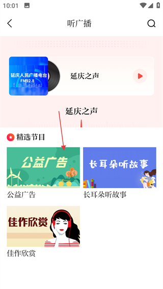 2、在听广播页面,点击公益广告,进入公益广告播放页面。