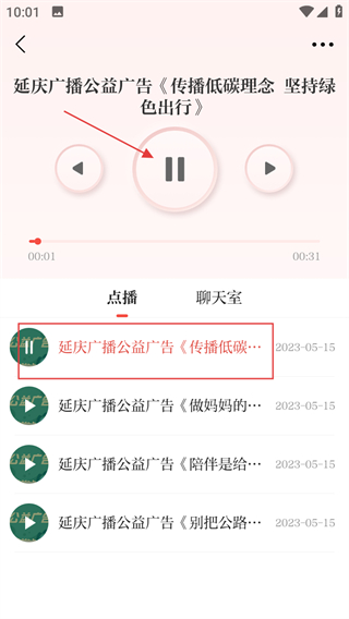 3、在公益广告播放页面,点击想收听的广告,即可收听该广告内容。