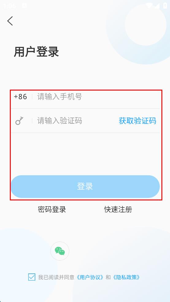 4、在用户登录界面输入手机号,点击获取验证码,输入验证码后点击登录,完成登录操作。